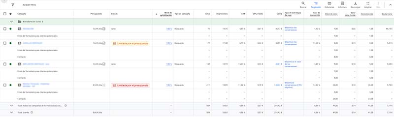 Aquí os dejamos un ejemplo de KPIs de una de nuestras campañas actuales; en este cuadro medimos el rendimiento de cada grupo de anuncios de todas nuestras campañas.